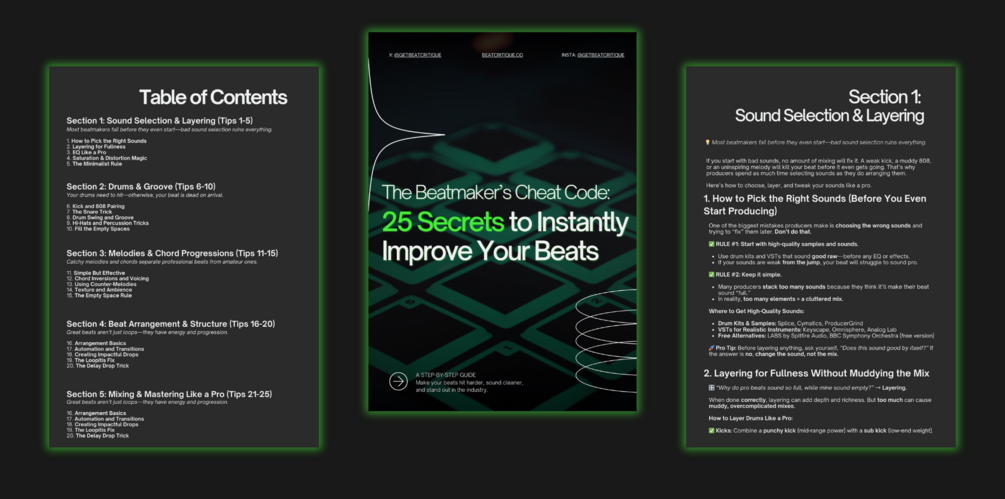 This ebook gives you 25 industry-proven secrets that will instantly upgrade your beats—no fluff, just real techniques used by top producers.